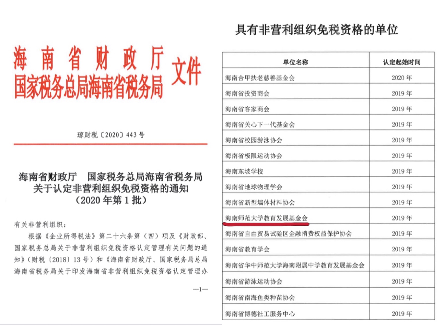 2020年6月,海南省财政厅、国家税务总局海南省税务局联合发布《关于认定非营利组织免税资格的通知(2020年第1批)》(2020年第443号文),海南师范大学教育发展基金会获得2020年度非营利组织免税资格,有效期为五年。